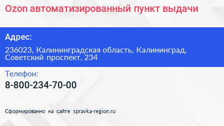 Ozon, автоматизированный пункт выдачи по адресу 236023, Калининградская область, Калининград, Советский проспект, 234 в дальнейшем Организация, размещена в следующих категориях: