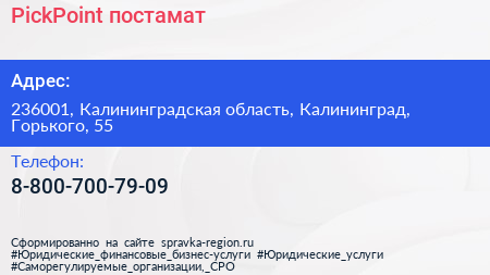 PickPoint, постамат по адресу 236001, Калининградская область, Калининград, Горького, 55 в дальнейшем Организация, размещена в следующих категориях: