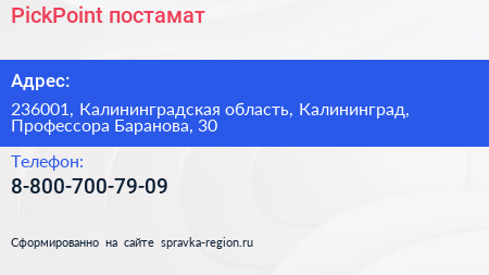 PickPoint, постамат по адресу 236001, Калининградская область, Калининград, Профессора Баранова, 30 в дальнейшем Организация, размещена в следующих категориях: