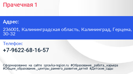 Прачечная №1 по адресу 236001, Калининградская область, Калининград, Герцена, 30-32 в дальнейшем Организация, размещена в следующих категориях: