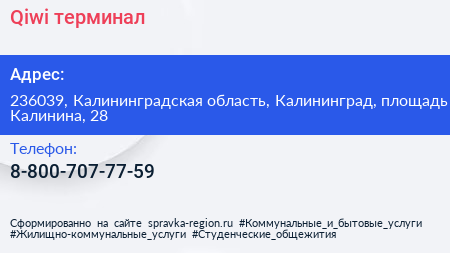 Qiwi, терминал по адресу 236039, Калининградская область, Калининград, площадь Калинина, 28 в дальнейшем Организация, размещена в следующих категориях: