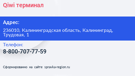 Qiwi, терминал по адресу 236010, Калининградская область, Калининград, Трудовая, 1 в дальнейшем Организация, размещена в следующих категориях: