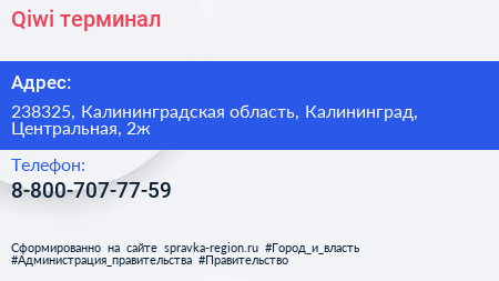 Qiwi, терминал по адресу 238325, Калининградская область, Калининград, Центральная, 2ж в дальнейшем Организация, размещена в следующих категориях: