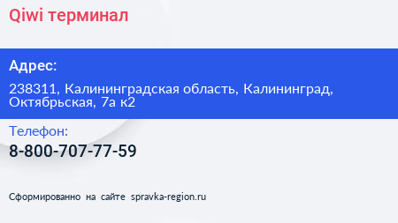 Qiwi, терминал по адресу 238311, Калининградская область, Калининград, Октябрьская, 7а к2 в дальнейшем Организация, размещена в следующих категориях: