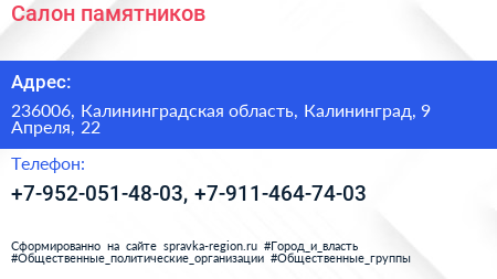 Салон памятников по адресу 236006, Калининградская область, Калининград, 9 Апреля, 22 в дальнейшем Организация, размещена в следующих категориях: