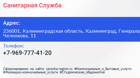 Санитарная Служба по адресу 236001, Калининградская область, Калининград, Генерала Челнокова, 11 в дальнейшем Организация, размещена в следующих категориях: