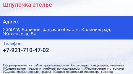 Шпулечка, ателье по адресу 236019, Калининградская область, Калининград, Жиленкова, 8а в дальнейшем Организация, размещена в следующих категориях: