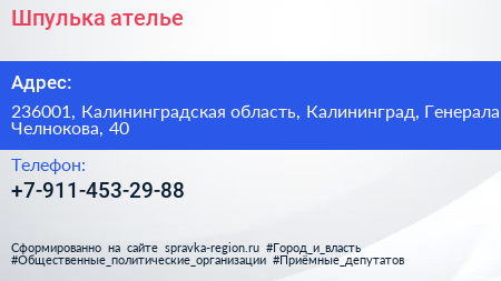 Шпулька, ателье по адресу 236001, Калининградская область, Калининград, Генерала Челнокова, 40 в дальнейшем Организация, размещена в следующих категориях: