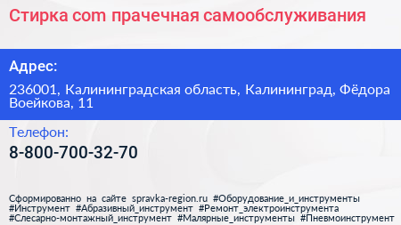 Стирка.com, прачечная самообслуживания по адресу 236001, Калининградская область, Калининград, Фёдора Воейкова, 11 в дальнейшем Организация, размещена в следующих категориях: