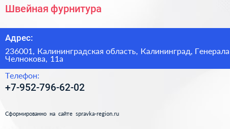 Швейная фурнитура по адресу 236001, Калининградская область, Калининград, Генерала Челнокова, 11а в дальнейшем Организация, размещена в следующих категориях: