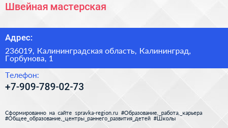 Швейная мастерская по адресу 236019, Калининградская область, Калининград, Горбунова, 1 в дальнейшем Организация, размещена в следующих категориях: