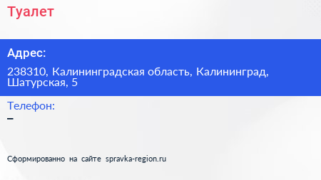 Туалет по адресу 238310, Калининградская область, Калининград, Шатурская, 5 в дальнейшем Организация, размещена в следующих категориях: