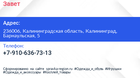 Завет по адресу 236006, Калининградская область, Калининград, Барнаульская, 5 в дальнейшем Организация, размещена в следующих категориях: