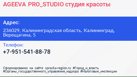 AGEEVA.PRO_STUDIO, студия красоты по адресу 236029, Калининградская область, Калининград, Верещагина, 5 в дальнейшем Организация, размещена в следующих категориях: