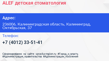 ALEF, детская стоматология по адресу 236006, Калининградская область, Калининград, Октябрьская, 37 в дальнейшем Организация, размещена в следующих категориях: