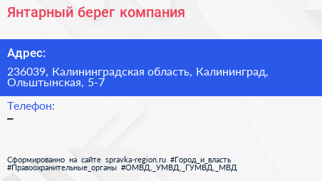 Янтарный берег, компания по адресу 236039, Калининградская область, Калининград, Ольштынская, 5-7 в дальнейшем Организация, размещена в следующих категориях: