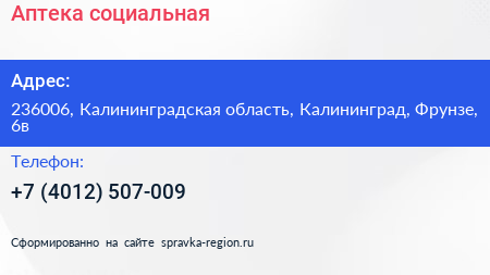 Аптека социальная по адресу 236006, Калининградская область, Калининград, Фрунзе, 6в в дальнейшем Организация, размещена в следующих категориях: