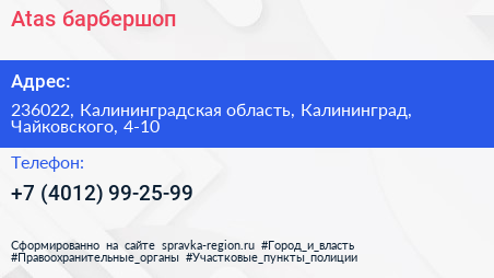 Atas, барбершоп по адресу 236022, Калининградская область, Калининград, Чайковского, 4-10 в дальнейшем Организация, размещена в следующих категориях: