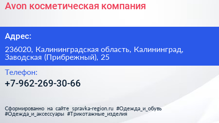 Avon, косметическая компания по адресу 236020, Калининградская область, Калининград, Заводская (Прибрежный), 25 в дальнейшем Организация, размещена в следующих категориях:
