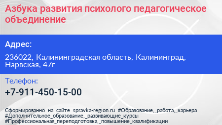 Азбука развития, психолого-педагогическое объединение по адресу 236022, Калининградская область, Калининград, Нарвская, 47г в дальнейшем Организация, размещена в следующих категориях: