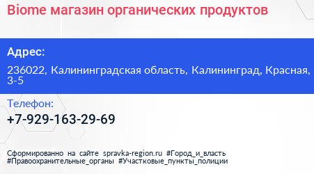 Biome, магазин органических продуктов по адресу 236022, Калининградская область, Калининград, Красная, 3-5 в дальнейшем Организация, размещена в следующих категориях: