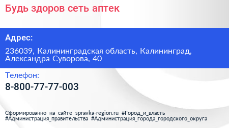 Будь здоров, сеть аптек по адресу 236039, Калининградская область, Калининград, Александра Суворова, 40 в дальнейшем Организация, размещена в следующих категориях: