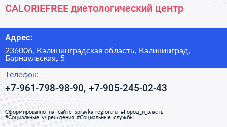 CALORIEFREE, диетологический центр по адресу 236006, Калининградская область, Калининград, Барнаульская, 5 в дальнейшем Организация, размещена в следующих категориях: