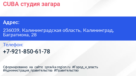 CUBA, студия загара по адресу 236039, Калининградская область, Калининград, Багратиона, 28 в дальнейшем Организация, размещена в следующих категориях: