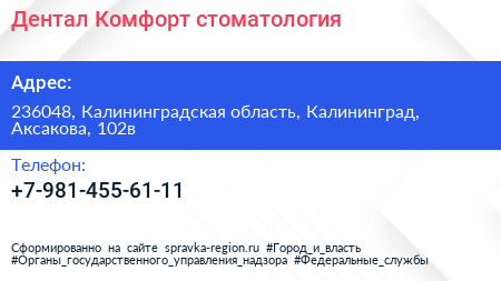 Дентал Комфорт, стоматология по адресу 236048, Калининградская область, Калининград, Аксакова, 102в в дальнейшем Организация, размещена в следующих категориях: