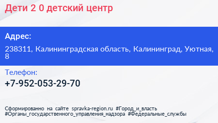 Дети 2.0, детский центр по адресу 238311, Калининградская область, Калининград, Уютная, 8 в дальнейшем Организация, размещена в следующих категориях: