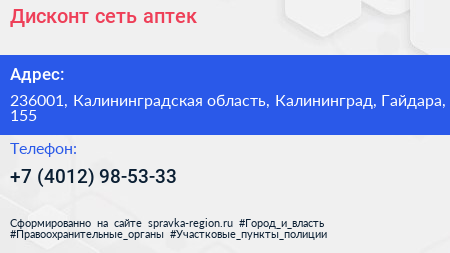 Дисконт, сеть аптек по адресу 236001, Калининградская область, Калининград, Гайдара, 155 в дальнейшем Организация, размещена в следующих категориях: