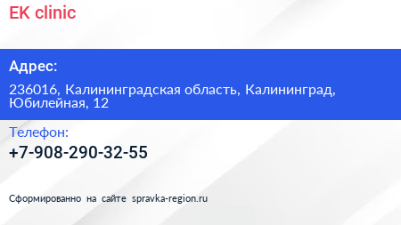 EK clinic по адресу 236016, Калининградская область, Калининград, Юбилейная, 12 в дальнейшем Организация, размещена в следующих категориях: