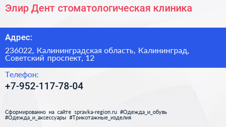 Элир-Дент, стоматологическая клиника по адресу 236022, Калининградская область, Калининград, Советский проспект, 12 в дальнейшем Организация, размещена в следующих категориях: