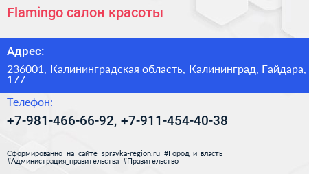 Flamingo, салон красоты по адресу 236001, Калининградская область, Калининград, Гайдара, 177 в дальнейшем Организация, размещена в следующих категориях: