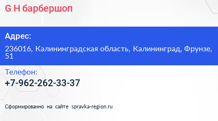 G.H, барбершоп по адресу 236016, Калининградская область, Калининград, Фрунзе, 51 в дальнейшем Организация, размещена в следующих категориях: