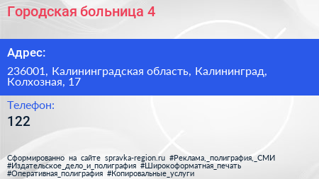 Городская больница №4 по адресу 236001, Калининградская область, Калининград, Колхозная, 17 в дальнейшем Организация, размещена в следующих категориях:
