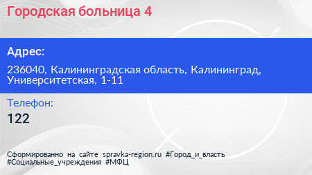 Городская больница №4 по адресу 236040, Калининградская область, Калининград, Университетская, 1-11 в дальнейшем Организация, размещена в следующих категориях: