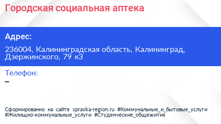 Городская социальная аптека по адресу 236004, Калининградская область, Калининград, Дзержинского, 79 к3 в дальнейшем Организация, размещена в следующих категориях:
