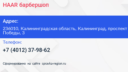 HAAR, барбершоп по адресу 236010, Калининградская область, Калининград, проспект Победы, 3 в дальнейшем Организация, размещена в следующих категориях: