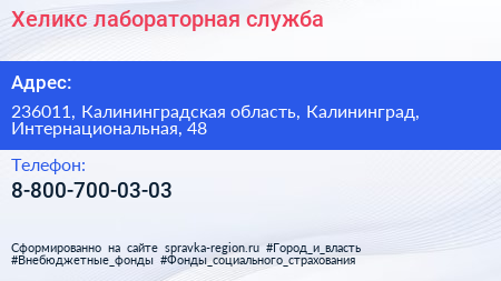 Хеликс, лабораторная служба по адресу 236011, Калининградская область, Калининград, Интернациональная, 48 в дальнейшем Организация, размещена в следующих категориях: