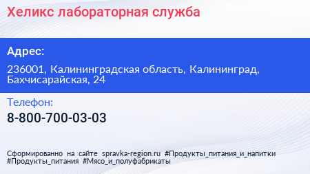 Хеликс, лабораторная служба по адресу 236001, Калининградская область, Калининград, Бахчисарайская, 24 в дальнейшем Организация, размещена в следующих категориях: