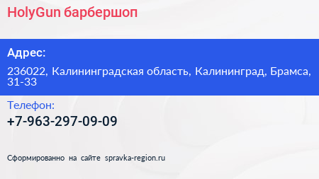 HolyGun, барбершоп по адресу 236022, Калининградская область, Калининград, Брамса, 31-33 в дальнейшем Организация, размещена в следующих категориях: