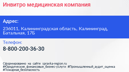 Инвитро, медицинская компания по адресу 236011, Калининградская область, Калининград, Батальная, 17Б в дальнейшем Организация, размещена в следующих категориях: