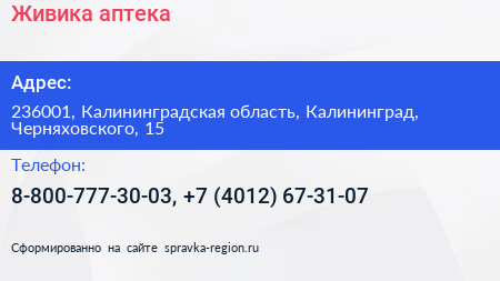Живика, аптека по адресу 236001, Калининградская область, Калининград, Черняховского, 15 в дальнейшем Организация, размещена в следующих категориях: