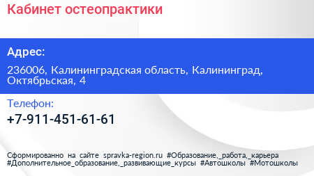Кабинет остеопрактики по адресу 236006, Калининградская область, Калининград, Октябрьская, 4 в дальнейшем Организация, размещена в следующих категориях:
