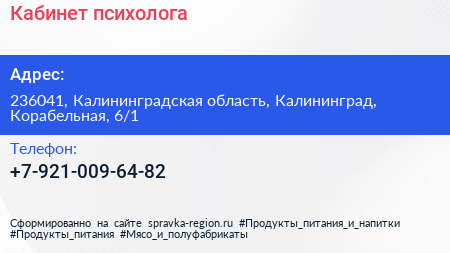 Кабинет психолога по адресу 236041, Калининградская область, Калининград, Корабельная, 6/1 в дальнейшем Организация, размещена в следующих категориях: