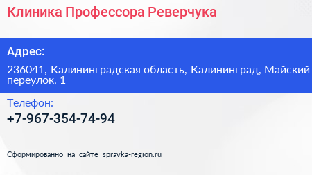Клиника Профессора Реверчука по адресу 236041, Калининградская область, Калининград, Майский переулок, 1 в дальнейшем Организация, размещена в следующих категориях: