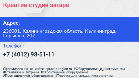 Креатив, студия загара по адресу 236001, Калининградская область, Калининград, Горького, 207 в дальнейшем Организация, размещена в следующих категориях: