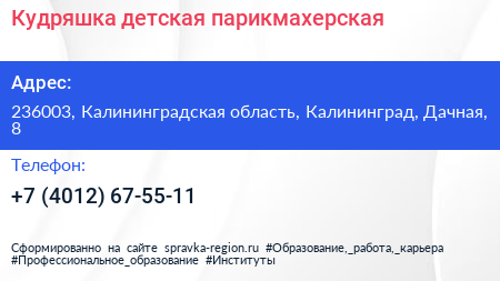 Кудряшка, детская парикмахерская по адресу 236003, Калининградская область, Калининград, Дачная, 8 в дальнейшем Организация, размещена в следующих категориях: