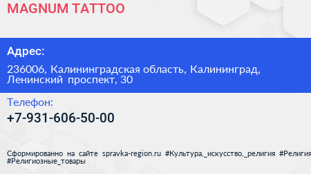 MAGNUM TATTOO по адресу 236006, Калининградская область, Калининград, Ленинский проспект, 30 в дальнейшем Организация, размещена в следующих категориях: